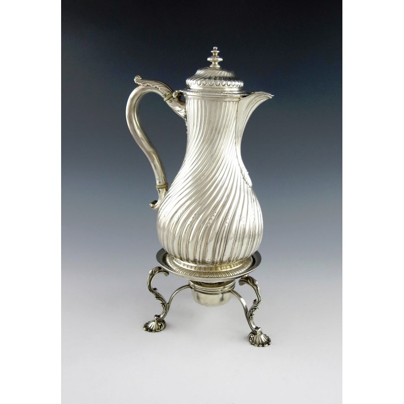 fluted baluster from, fluted domed cover, later leaf capped scroll handle, (correctly part-marked), on a circular gadroon foot, the stand of circular form, on three scroll legs on pad feet, with a burner, height 33cm, approx. weight 33oz. (2)