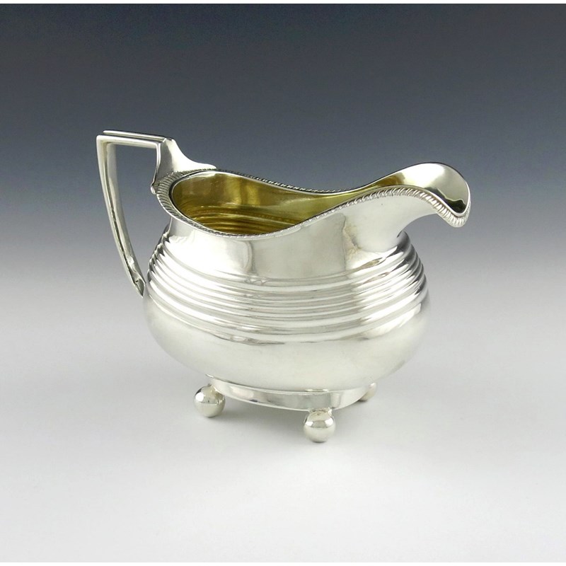 rounded rectangular form, fluted girdle and gadrooned border, on four ball feet, scroll handle, length 15.7cm, approx. weight 6.3oz.