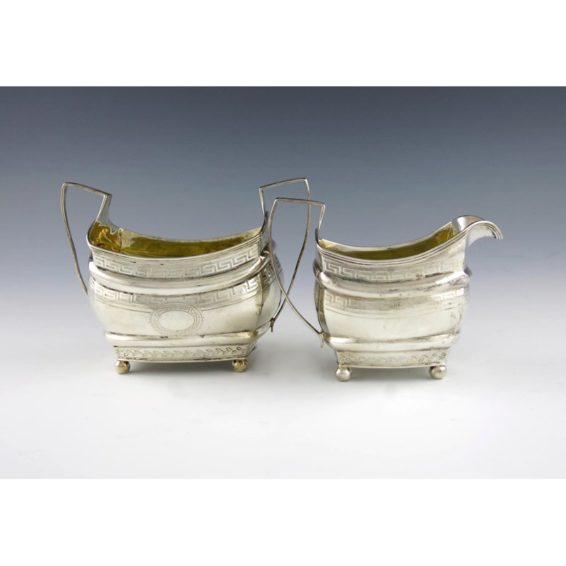 rounded rectangular form, scroll handles, Greek key borders, on four ball feet, height of cream jug 11cm, approx. weight 12.5oz. (2)