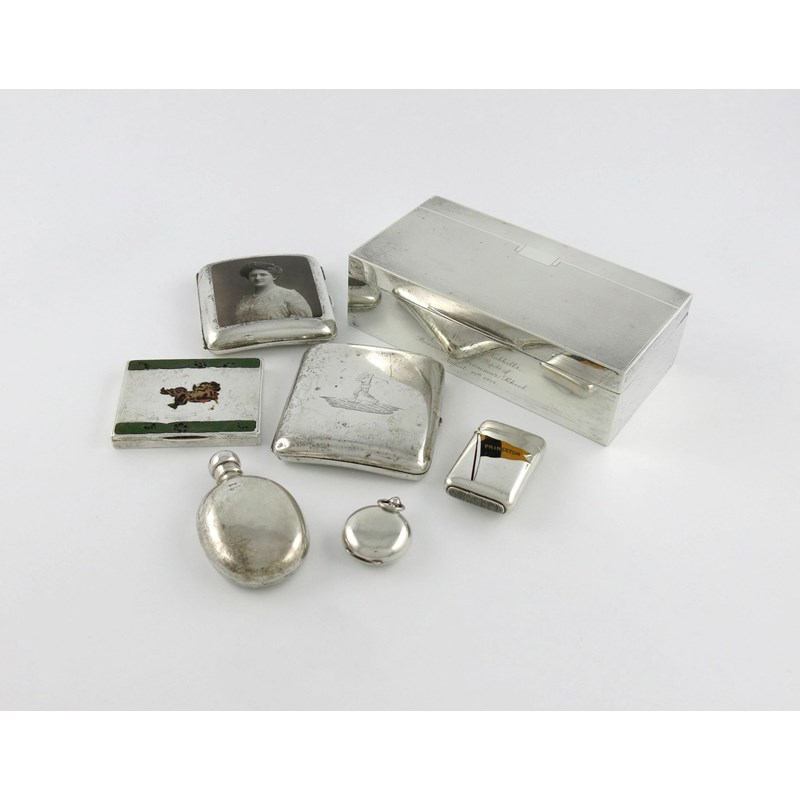 comprising: an Asprey cigarette case, London 1928, the cover decorated with a Chinese dog of war, with green borders, plus a cigarette case, the cover engraved with a golfer, a cigarette case, the cover enamelled with a lady, a sovereign case, a small spirit flask, and a cigarette box, plus an American electroplated vesta case, enamelled with the flag 'Princeton', the reverse applied with two baseball bats and inscribed 'Championship 1891 from Princeton Club N.Y', approx. weighable 14oz. (7)