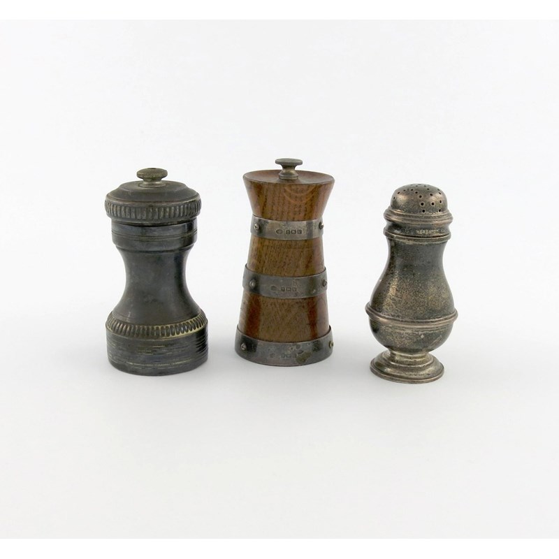churn form, with plain bands, plus a French silver pepper mill, and a silver bun pepper pot, London 1968, approx. weighable 2oz. (3)