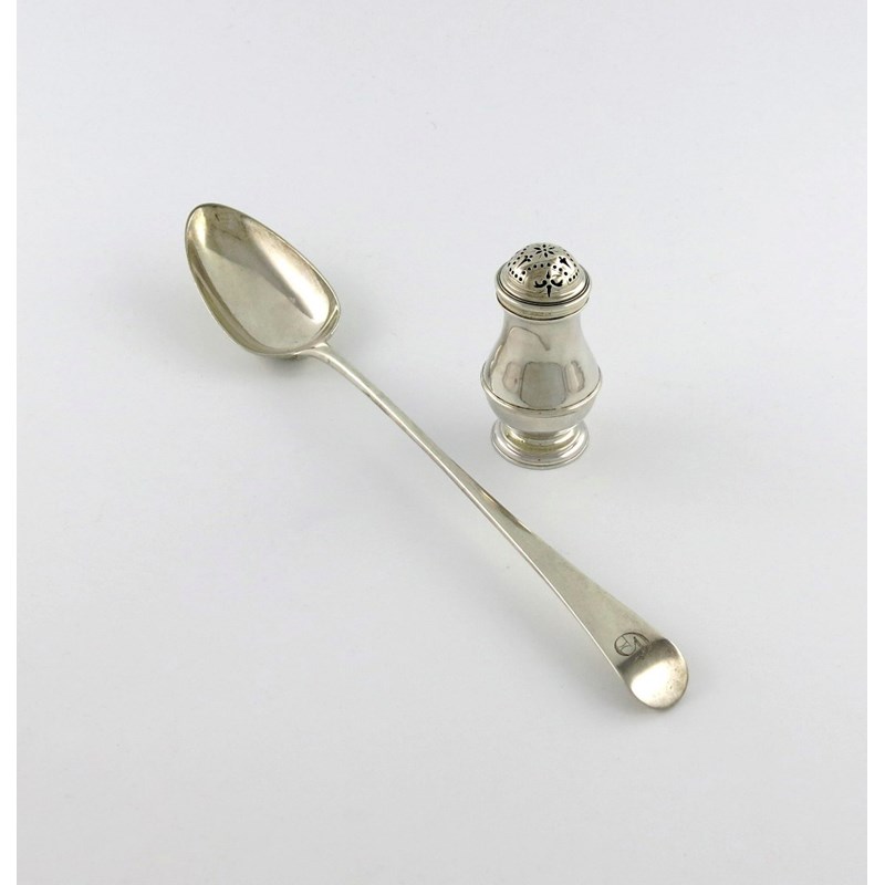 the terminal with a crest, plus an 18th century silver bun pepper pot, of baluster form, on a circular foot, marks partially worn, approx. total weight 5.5oz. (2)