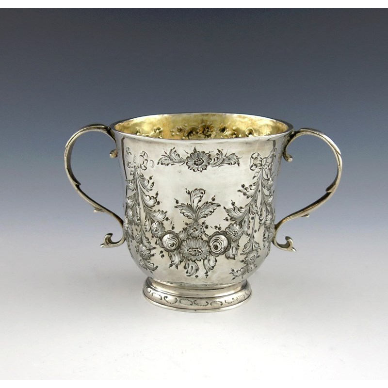 circular form, embossed foliate decoration, scroll handle, gilded bowl, on a circular foot, height 10.7cm, approx. weight 7.5oz.