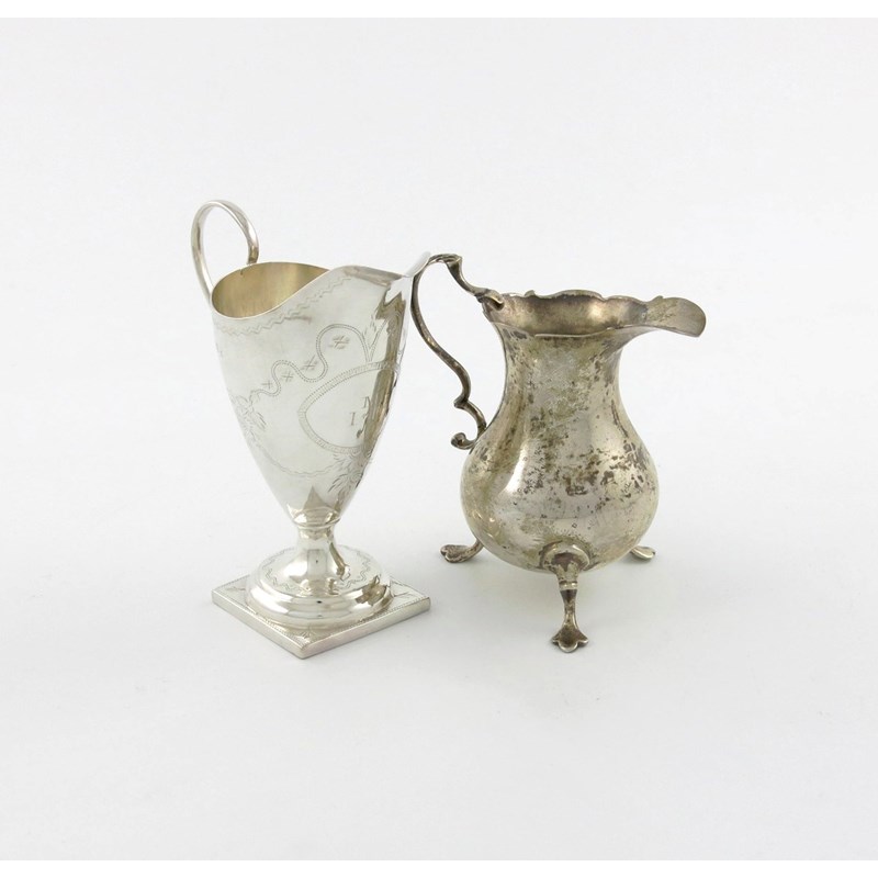 helmet form, scroll handle, engraved foliate decoration, on a raised square foot, scratch initialled, height 11.5cm, plus a George III silver cream jug, by David Mowden, London 1767, baluster form, leaf capped scroll handle, on four scroll legs, approx. total weight 4.4oz. (2)