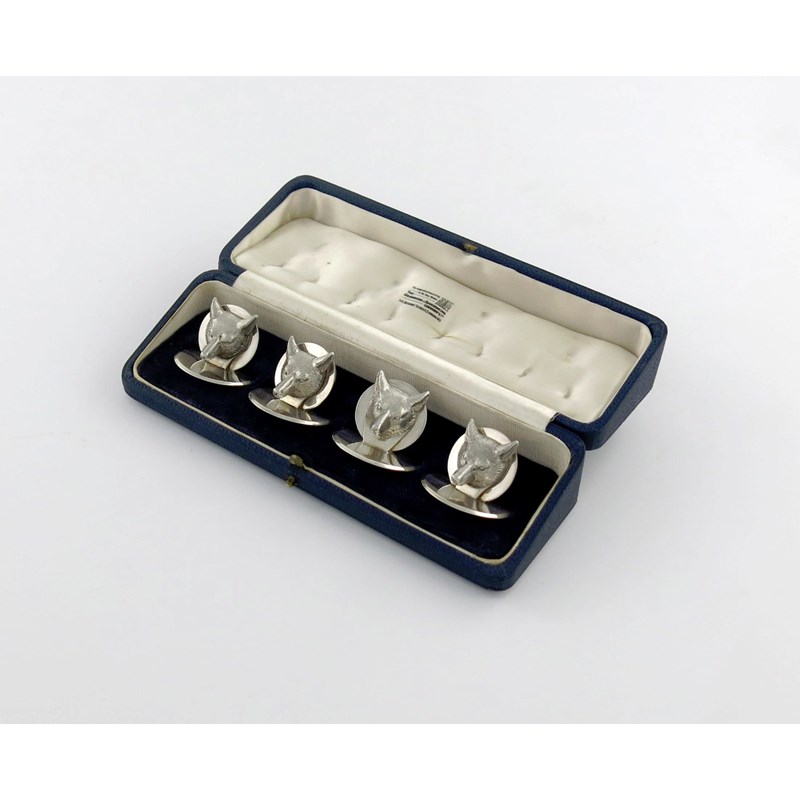 A set of four cast silver fox mask menu card holders,