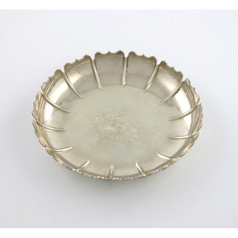 fluted circular form, the centre engraved with the Royal Coat of Arms, diameter 14.4cm, approx. weight 7oz.