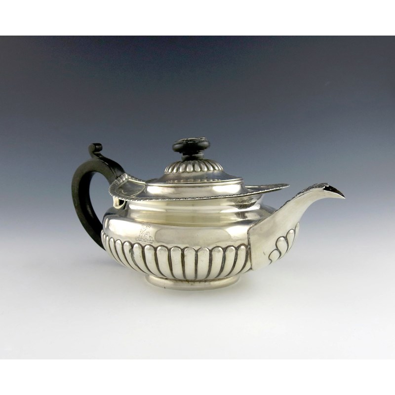 circular form, part fluted decoration, scroll handle, gadroon border, the hinged cover with a foliate finial, engraved with a crest, length handle to spout 27cm, approx. weight 23oz.