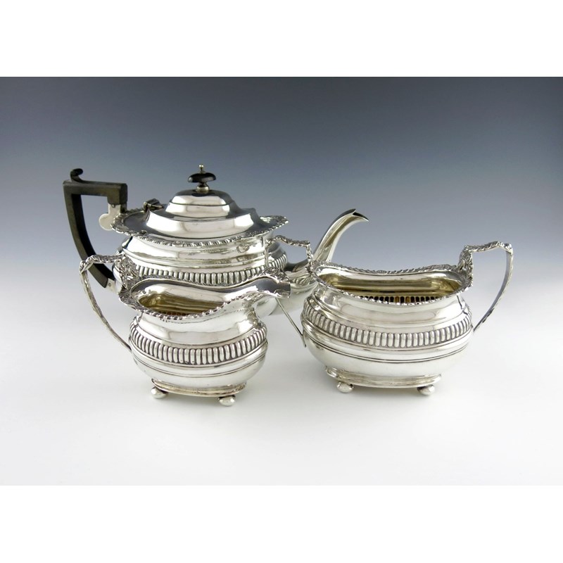 oblong bellied form, part-fluted decoration, shell and gadroon border, on four bun feet, length handle to spout 29.5cm, approx. weight 36.5oz. (3)