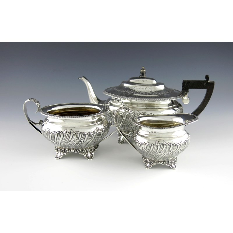 oval form, with a gadrooned border, embossed fluted decoration, scroll handle, on four pierced foliate feet, the tea pot with a presentation inscription '1888-1906 to Miss Louisa Clay from the Committee and Surgeons of The Royal National Orthopedic Hospital', length handle to spout 27.3cm, approx. weight 34.9oz. (3)