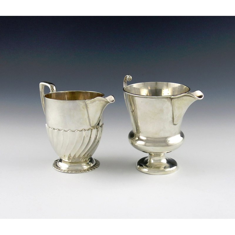 circular form, swirl fluted decoration, scroll handle, circular foot with gadrooned border, height 10cm, plus a silver cream jug, by Horace Woodward & Co Ltd, London 1907, plain baluster form, scroll handle, on a raised circular foot, height 10.2cm, approx. weight 10oz. (2)