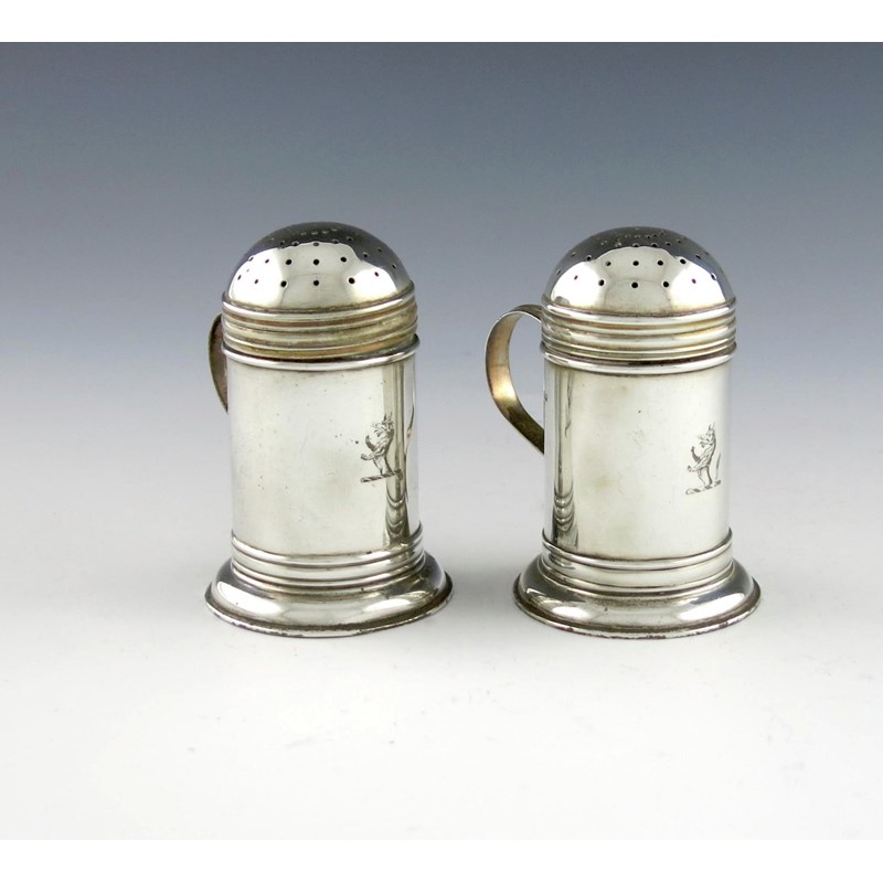 cylindrical form, domed cover, scroll handle, engraved with a crest, height 8.5cm, approx. weight 6oz. (2)
