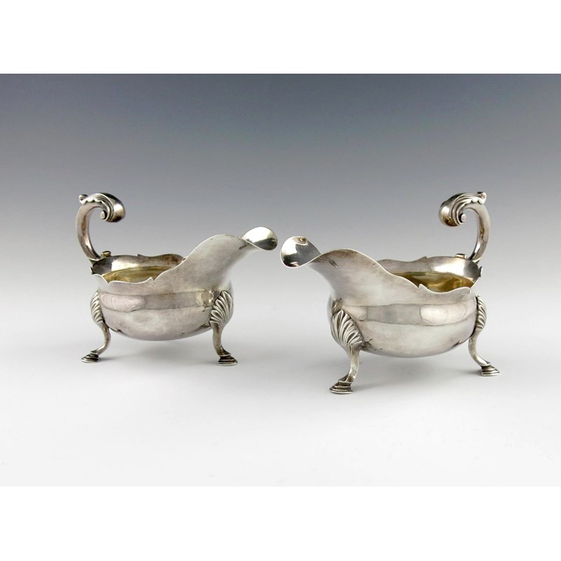 plain oval form, leaf capped scroll handle, wavy edge borders, on three shell capped hoof feet, length 15.5cm, approx. weight 14.7oz. (2)