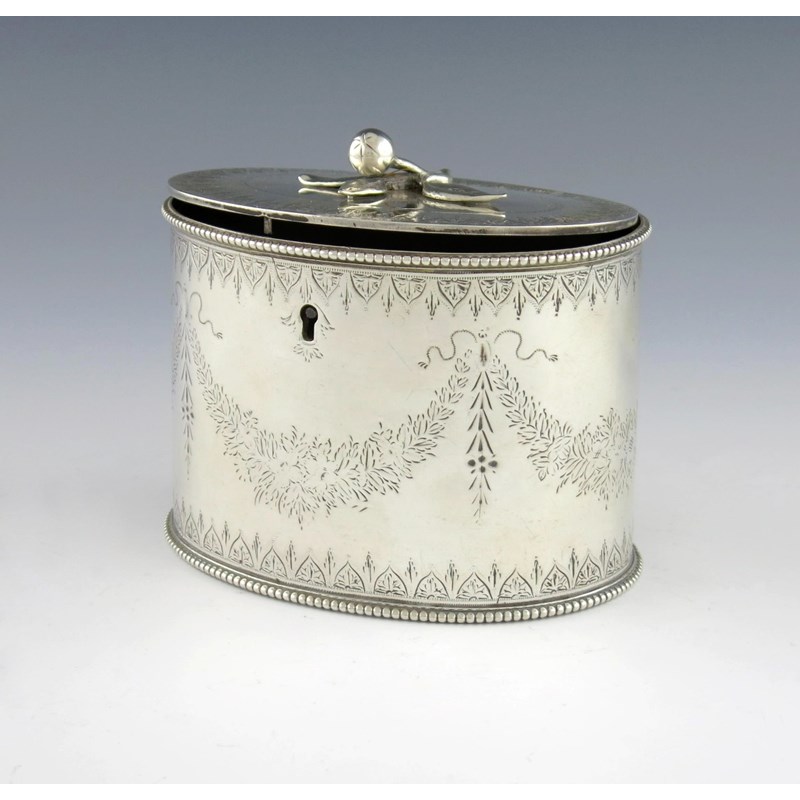 oval form, engraved with ribbon tied swags and foliate decoration, the flush hinged cover with a melon finial, beaded borders, length 12.8cm, approx. weight 12.8oz.