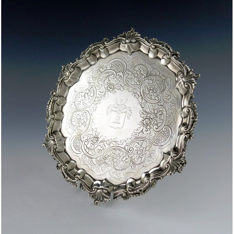 circular form, shell and scroll border, the centre with chased foliate scroll decoration, with an armorial, on three foliate shell bracket feet, diameter 26cm, approx. weight 16.5oz.