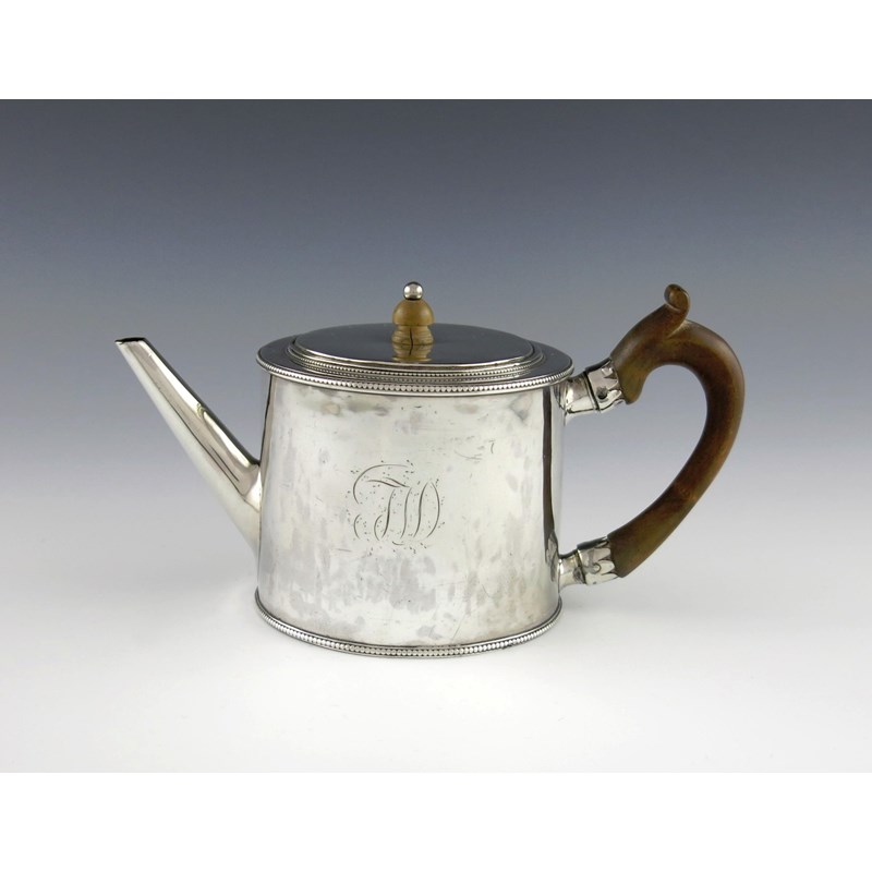 circular drum form, scroll handle, beaded borders, pull-off cover with a wooden finial, engraved with a monogram, length handle to spout 22cm, approx. weight 14.2oz.