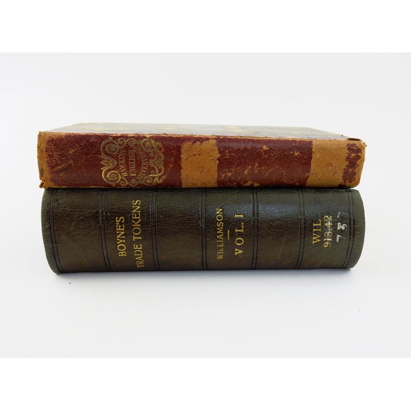 Books: Hawkins, Edward, The Silver Coins of England, London, 1841, stamps and label of Gloucester City Libraries and Museum, half leather, internally a clean copy with only minor stains and foxing; Williamson, George C. [and Boyne, William], Trade Tokens issued in the 17th Century, vol I only (Bedfordshire to London), London, 1889, half leather, stamps and label of Cheltenham Public Library. Internally a clean copy with only minor stains and foxing. (2)