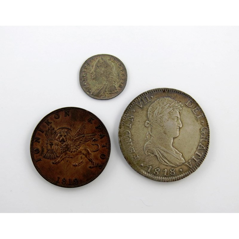 Mexico, Ferdinand VII, 8-Reales, 1818 J.J., very fine; minor British coins, including Sixpence, 1758; Ionian Islands, George III, copper 2-Oboli and Obol, 1819 (KM.32, 33; Pr.18, 19); sundry other coins in silver and copper, contained in Sandhill folder, fine and better. (qty)