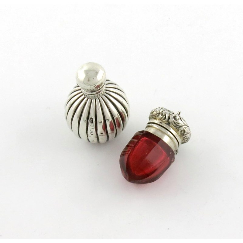 faceted red glass body, the hinged cover with foliate decoration, length 4cm, plus a Victorian silver scent bottle, of fluted circular form. (2)