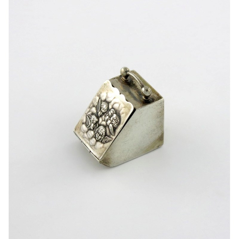 possibly for stamps or rings, the hinged front embossed with angel heads, silk lined, height 3.5cm.