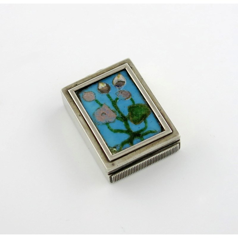rectangular form, the hinged cover inset with an enamelled panel of flowers on a light blue ground, length 5cm, approx. weight 1.5oz.