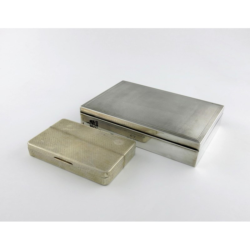rectangular form, engine turned decoration, length 16cm, plus a silver cigarette box, the hinged cover with engine-turned decoration, initialled, wood lined, length 23.7cm, approx. weighable 5oz. (2)