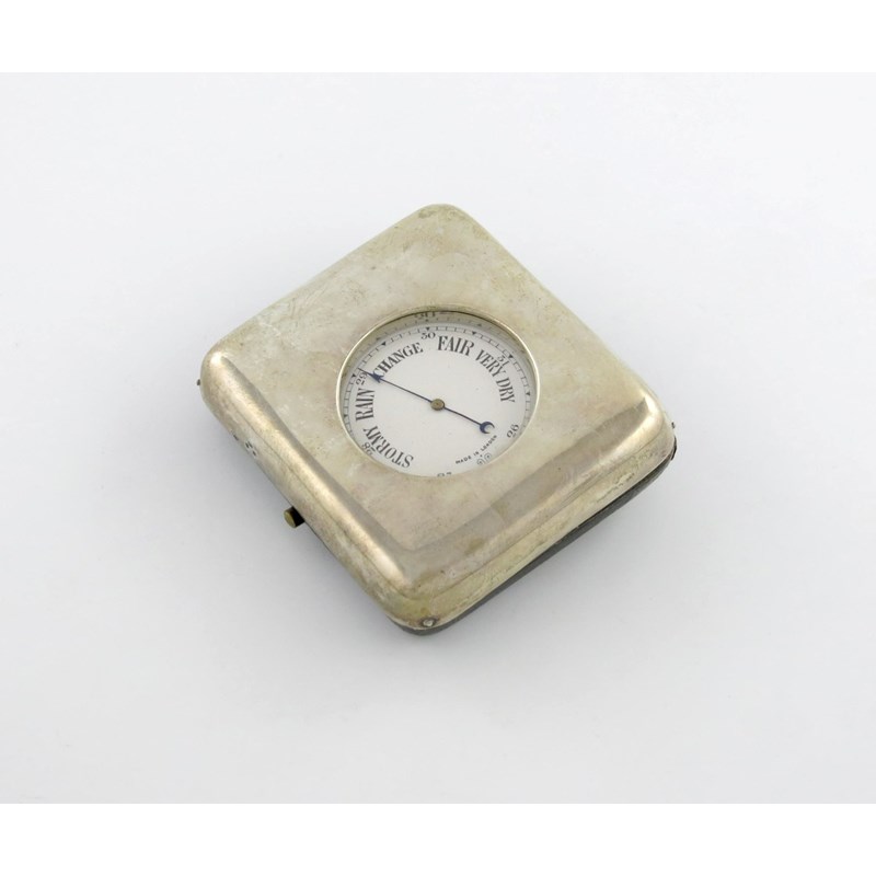 plain rectangular form, hinged front with an electroplated barometer, height 11.2cm.