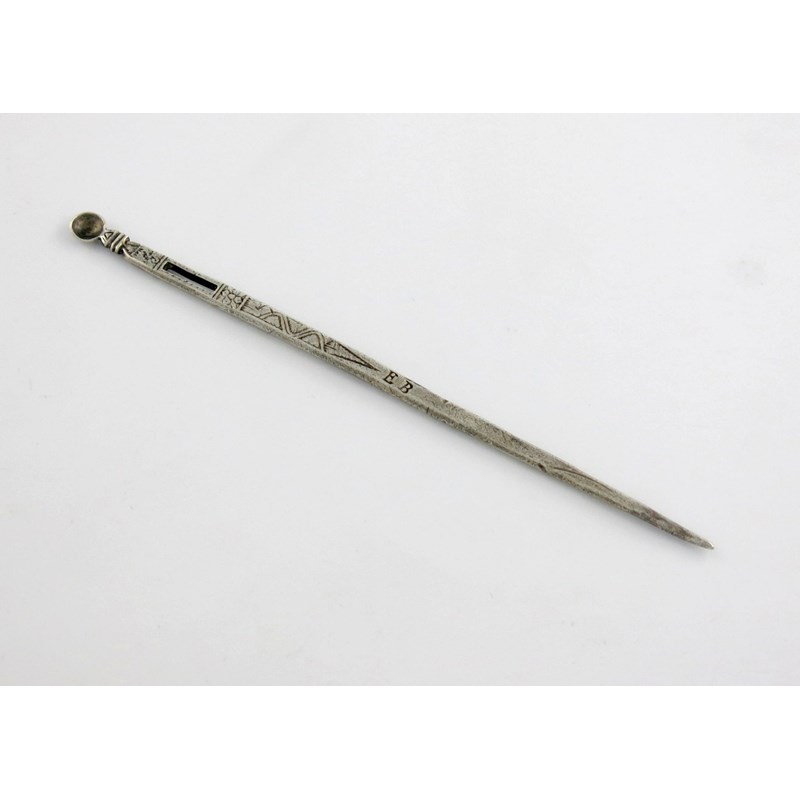 flattened tapering hexagonal form, engraved decoration, with an eye and slot, and a small 'cup' spatula, scratch initialled 'EB', length 14cm, approx. weight 0.4oz.
