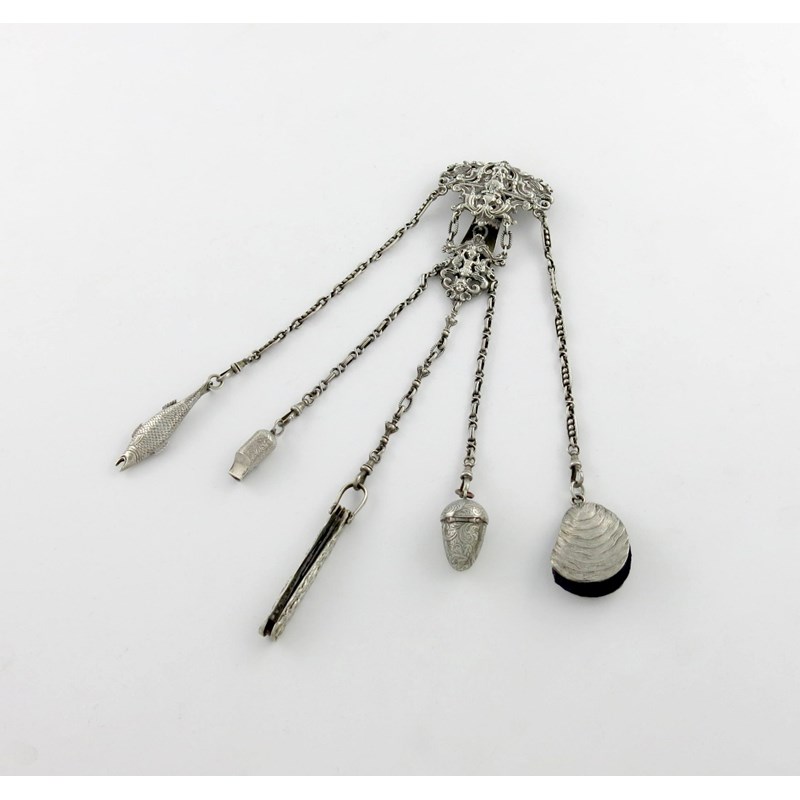pierced and embossed foliate, mask and cherub decoration, with five chains and the following unmarked implements: an oyster shell pin wheel, a pen knife, small engraved whistle, a thimble holder and an extending fish pencil, by Mordan & Co, (mechanism a/f).