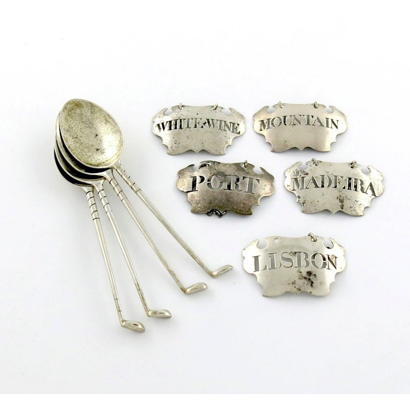 by Sandilands Drinkwater, London circa 1750, plain escutcheon form, pierced 'MOUNTAIN', 'LISBON', 'WHITE.WINE', 'PORT', and 'MADEIRA', plus four silver golf spoons, approx. weight 3.9oz. (9)