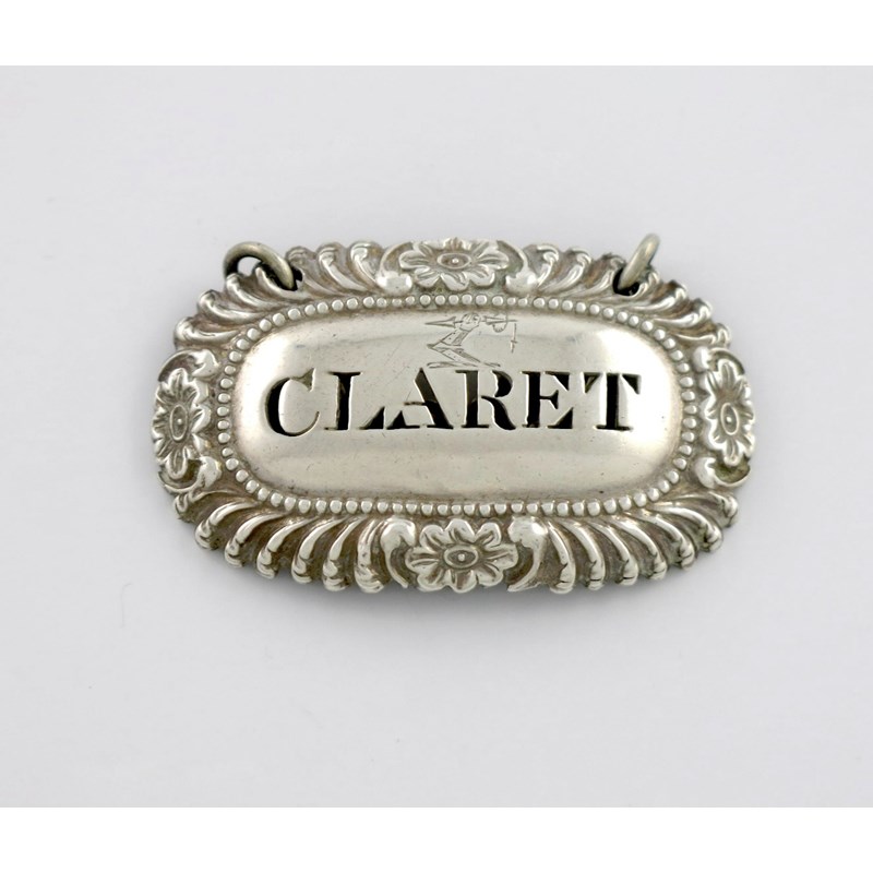 oblong form, foliate and gadroon border, pierced 'CLARET', length 4.7cm, approx. weight 0.6oz.
