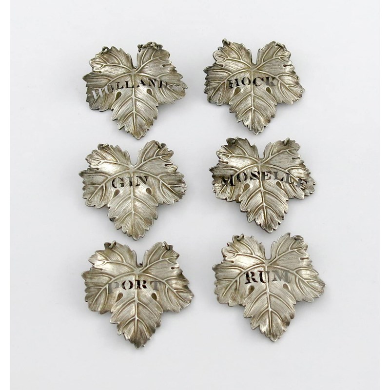 vine leaf form, pierced 'GIN', 'HOCK', 'HOLLANDS', 'MOSELLE', 'RUM' and 'PORT', length 5.2cm. (6)