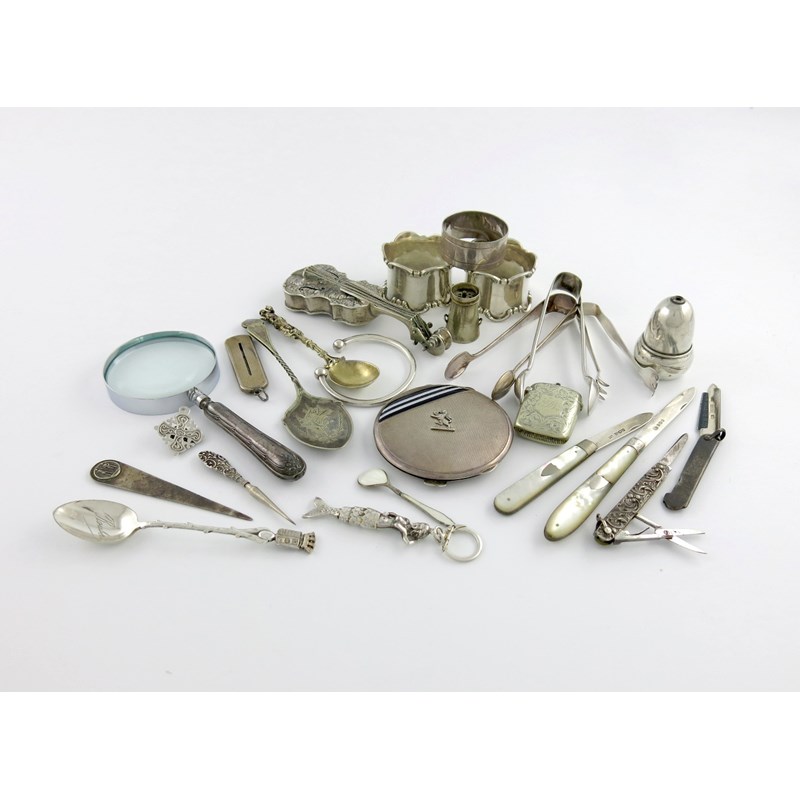 A mixed lot of silver items, comprising: a folding penknife/razor, a pair of napkin rings, a magnifying glass, a compact, a continental metalware miniature cello, two fruit knives, an acorn salt pot, plus other items including electroplated pieces. (qty)