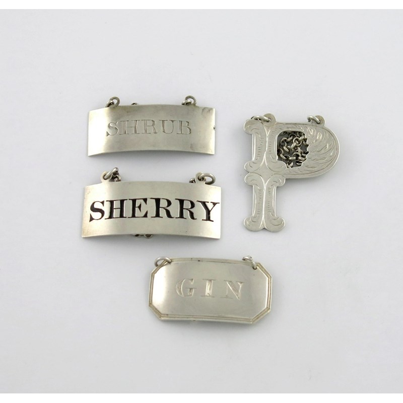 comprising: one of rectangular form, by Mitchell and Russell, Edinburgh circa 1805, incised 'SHRUB', one of rectangular form, by J. Millidge, Edinburgh circa 1825, canted corners, incised 'GIN', another by John Millidge, incised and blackened 'SHERRY', and one by James McKenzie, modelled as the letter 'P', approx. weight 1.3oz. (4)