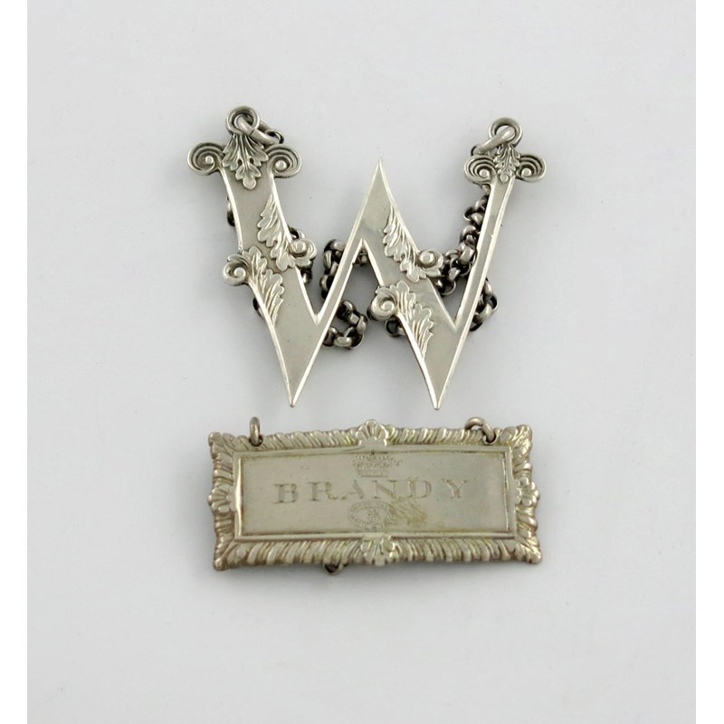 rectangular form, gadroon border, engraved with the royal crown and garter ribbon, incised 'BRANDY', length 4.8cm, plus a George IV Scottish silver 'cut-out' letter label, by George Horton, Birmingham 1828, modelled as a 'W', with foliate decoration. (2)