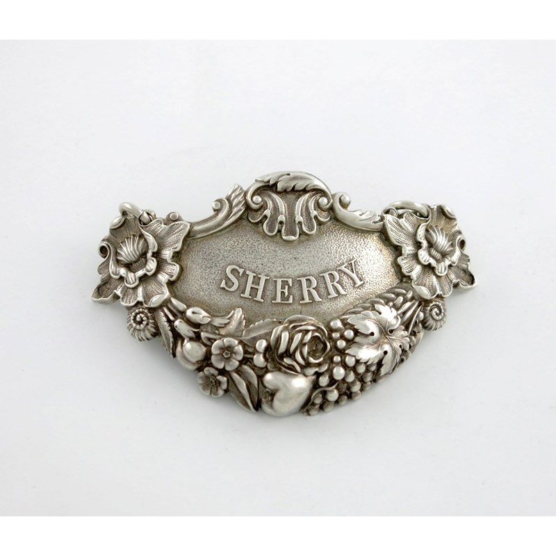 shaped form, heavily decorated with flowers, vines and shell decoration, embossed 'SHERRY', length 8.2cm, approx. weight 1.6oz.