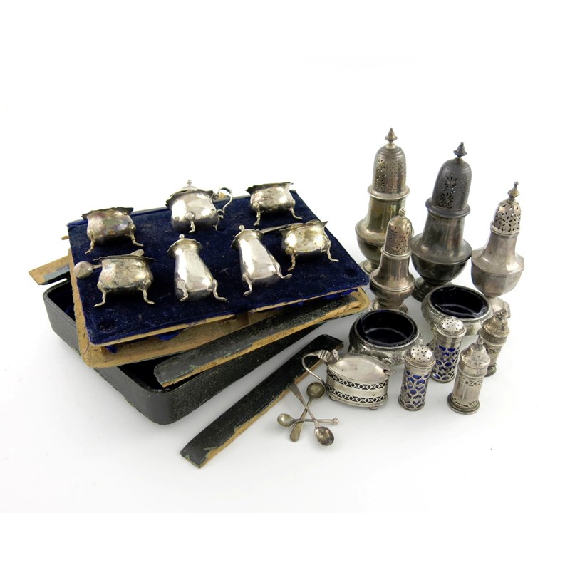 comprising: a pair of sugar casters, by the Goldsmiths and Silversmiths, London 1923, baluster form, a pair of George III cauldron salt cellars, a caster, a mustard pot, three pepper pots, a George III caster, and a cased seven-piece condiment set, of circular form, case a.f, approx. weight 26oz. (qty)