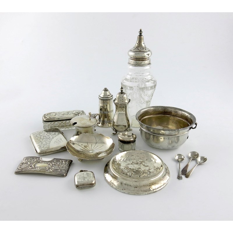 comprising: a sovereign case, of square form, a circular bowl, a silver-mounted glass sugar caster, a cigarette case, a mustard pot, a trinket pot, a trinket box, a card case, a bowl, a dish, a pepper and salt pot, two salt spoons, a pin dish, and an electroplated salt spoon, approx. weighable 13oz. (qty)