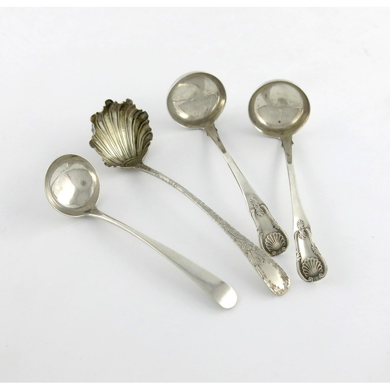 comprising: a provincial toddy ladle, the bowl re-shaped, by Charles Jamieson, Inverness circa 1810, a pair of King's pattern toddy ladles, Edinburgh 1833, and a single toddy ladle, by Alexander Henderson, Edinburgh 1809, approx. weight 3.8oz. (4)