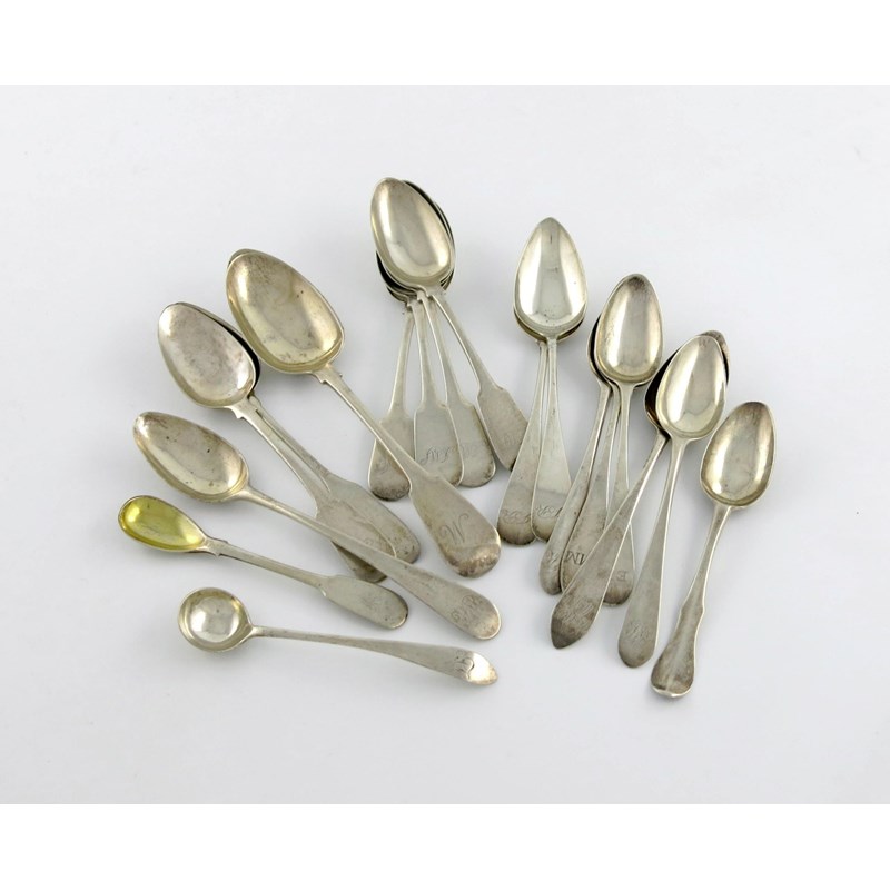 comprising: a pair by William Hannay, Paisley, two Greenock spoons, one of which is by John Heron, plus a set of four Aberdeen teaspoons, by Alexander Mollison, an Aberdeen dessert spoon, five further Aberdeen teaspoons and a mustard spoon, a Dundee salt spoon, by Edward Livingstone and two other spoons, approx. weight 8oz. (18)