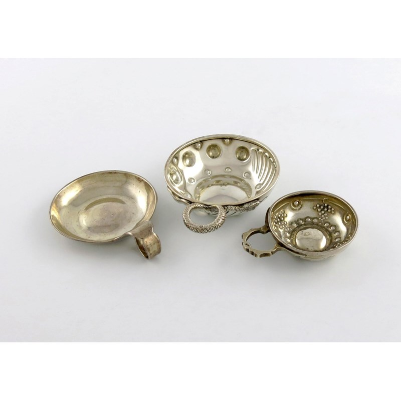 comprising: a 19th century one of plain circular form, scratched 'P' and 'DE HU', diameter 7cm, plus a wine taster of circular form, part-fluted and punch bead decoration, and a smaller wine taster, approx. total weight 4.3oz. (3)