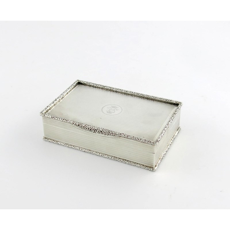 rectangular form, engine-turned decoration, foliate scroll borders, the hinged cover with the crest of Cavendish-Bentinck, 9th Duke of Portland, length 14cm, approx. weight 14oz.