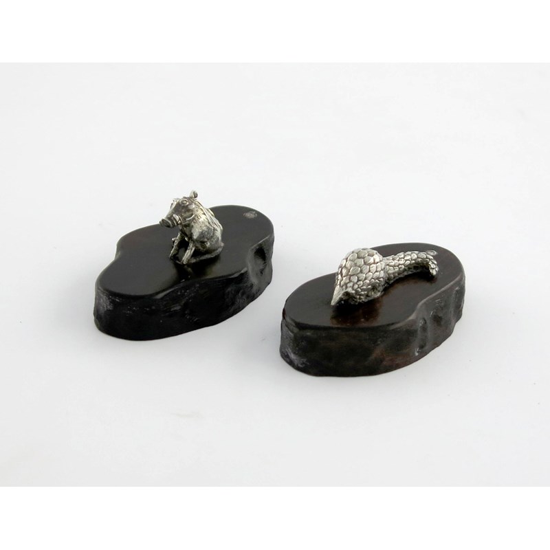 modelled as a Warthog scratching himself and a pangolin, on wooden bases, length of bases, in one box, 6.2cm and 6cm. (2)