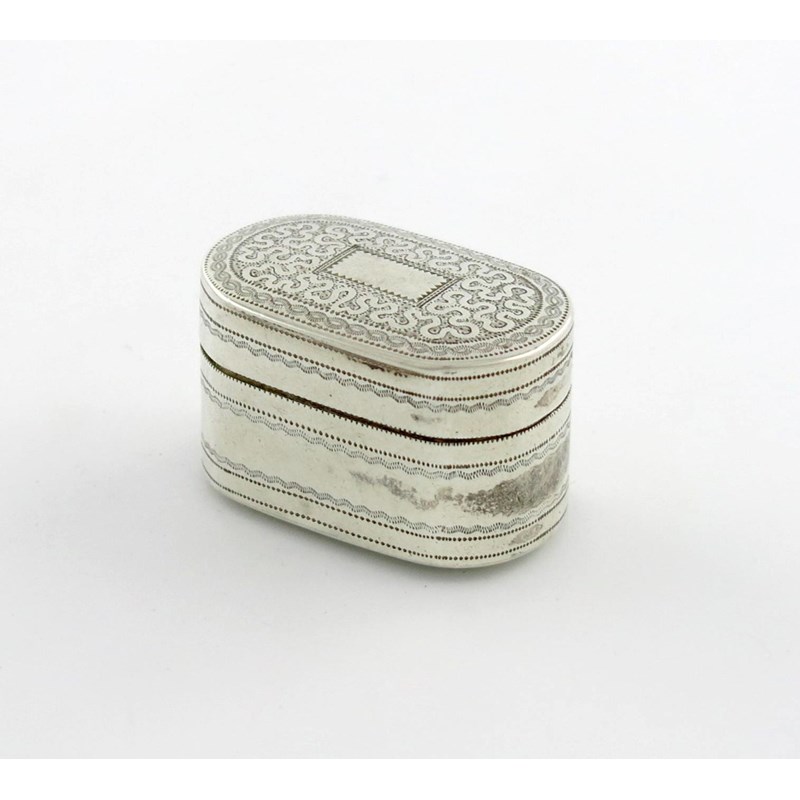oblong form, the hinged cover with engraved wriggle-work decoration, the interior with a hinged grater, length 3.5cm, approx. weight 0.6oz.