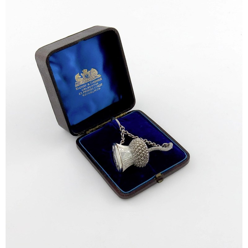 the thistle with a hinged cover engraved with thistles and initials, the interior with a pierced silver-gilt grille, and with a chain and ring attachment, length 5.4cm, approx. weight 0.8oz.