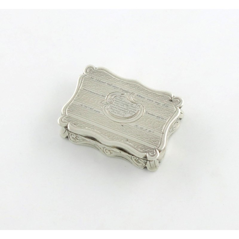 shaped rectangular form, with bands of engine-turned decoration, the interior with a silver-gilt pierced foliate scroll grille, the cover with an Afrikaans inscriptions, which roughly translates as ' I present/give you this in memory of my E.D Lover/Husband my Sister A.G.W.A.W.K... to R.M.J.W', 'The deceased was in her young age of 20 years and 10 months on the evening of 6 July, Capetown 1854'. Buried 25 07 54', length 3.8cm, approx. weight 0.6oz.