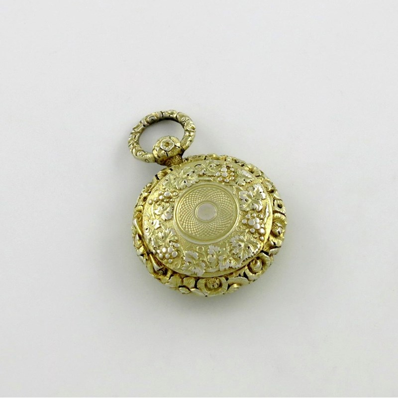 circular pocket watch form, chased foliate decoration, the hinged cover opens to reveal a pierced foliate scroll grille, diameter 3.7cm, approx. weight 1.2oz.