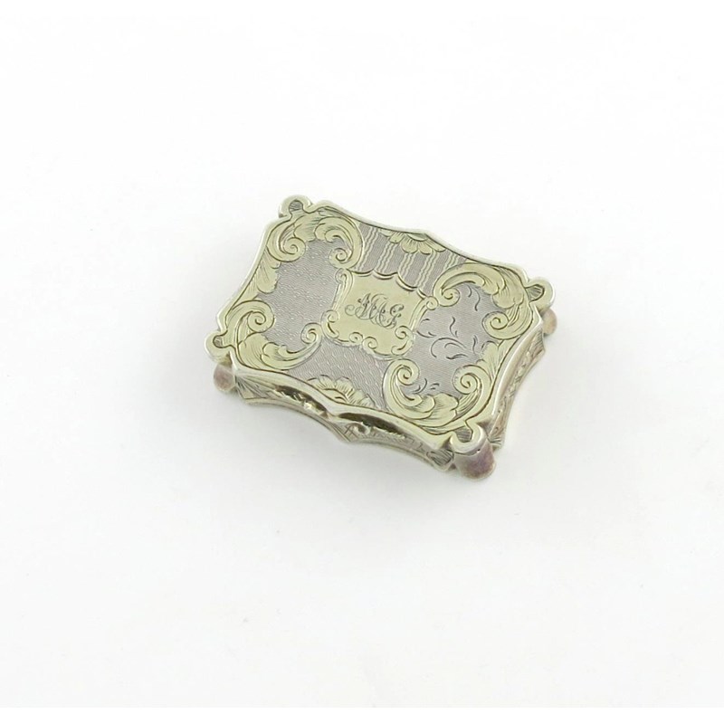 shaped rectangular form, engine-turned and foliate scroll decoration, the interior with a pierced foliate scroll grille, the cover initialled, length 3.5cm, approx. weight 0.5oz.