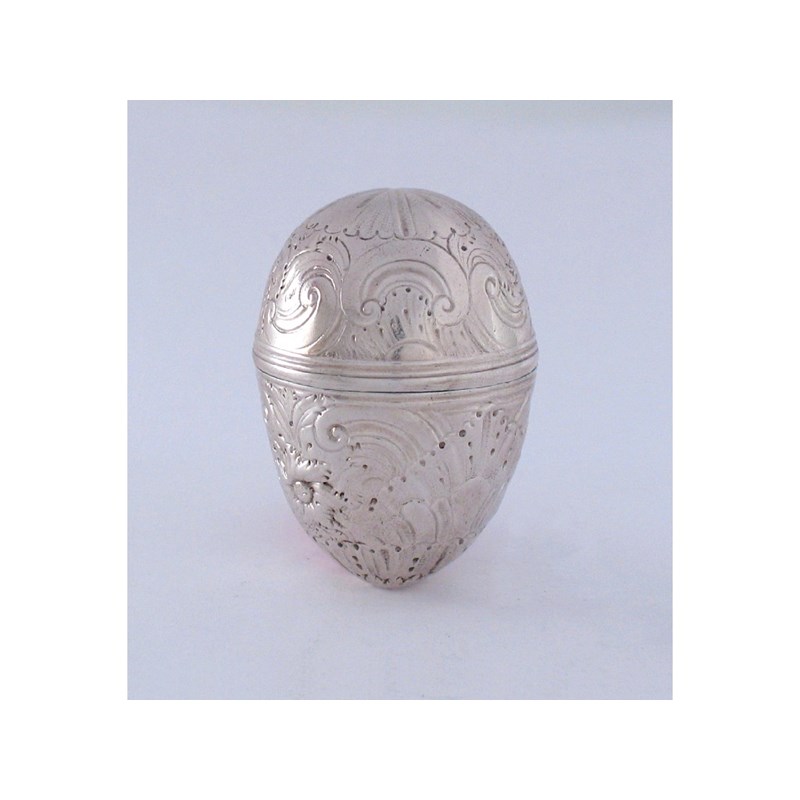 A George III egg, chased all over with flowers, scrolls and shells, unscrewing inhalf to reveal a steel grater, maker's mark only, by Samuel Meriton II, London, c.1775, 1.75in (4.5cm).