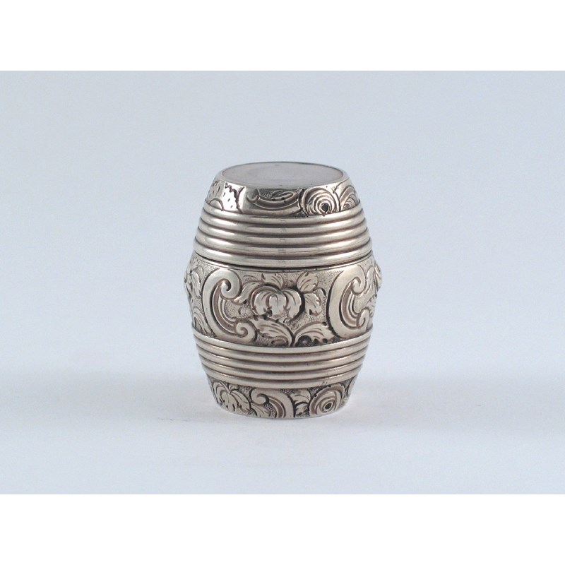 A George III barrel, decorated with alternating bands of reeding and chased floral scrolls, unscrewing to reveal a mounted steel grater, maker's mark only [struck twice], by Daniel Field, London, c.1760, 1.4in (3.5cm).