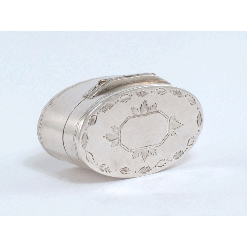 A George III oval box, with pricked borders, a hinged cover, with bright cut foliage and a vacant cartouche and a hinged grater, by Thomas Wilmore, Birmingham 1798, 1.6in (4cm).